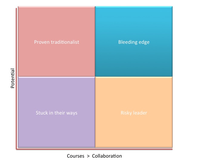So how might you bracket Learning Management Systems? Well, here’s a very basic mockup of an alternative from me with ‘Potential’ (which would partly be based on track record but also future gazing where, for example, there is a big VC financial backing) vs. a ‘Course > Collaboration’ judgment on the basis of a system’s cope from launching SCORM and resources as opposed to something which could actually act as your social enterprise hub. I would argue this offers a different paradigm to ‘performance’ which would help identify what type of system you are looking at.
