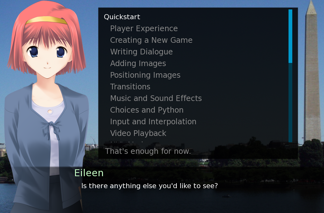 PCGamer considers some of the options in this article. In addition, there are some useful threads on Reddit, both in instructional design and gaming channels [warning not all are safe for work if you go looking]. For example it was here that I realised that many tools are combining RenPy with 3D model assets from DAZ. RenPy’s tutorial, built within the tool, is actually very good and shows how well it can work: