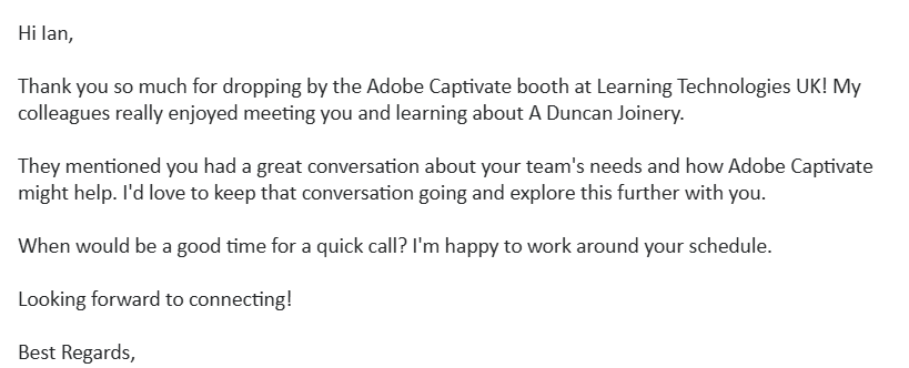 All in all, very bizarre – as I’ve said before, the better service in the learning industry seems to be where learning folks are involved in marketing and customer service. Anyways, the reason for the post is the below from Adobe – telling me how interesting it was to talk with me at an event I did not attend, about a company I have never worked for. Just wow:
